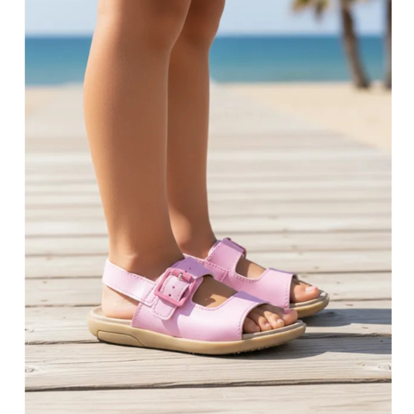 Na cor Petúnia, a sandália apresenta um visual feminino e lúdico, com detalhes suaves que combinam facilmente com vestidos, saias e looks casuais. O cabedal resistente garante durabilidade, enquanto o fechamento em fivela permite ajuste seguro e facilidade no calce, incentivando a autonomia da criança.