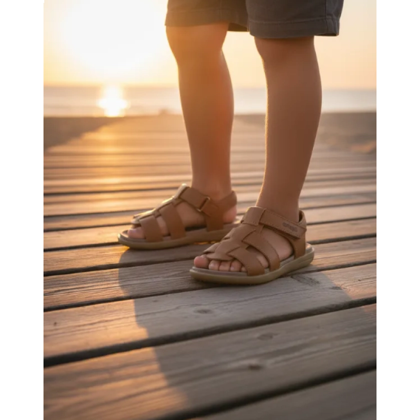 Seu cabedal é confeccionado em material macio e durável, proporcionando conforto aos pés e evitando atritos mesmo durante longos períodos de uso. As tiras garantem um ajuste firme e seguro, enquanto o fechamento em tira aderente facilita o calce e promove mais autonomia para a criança.