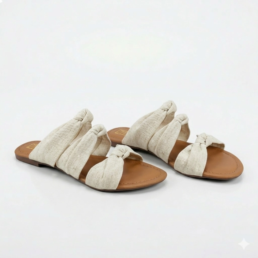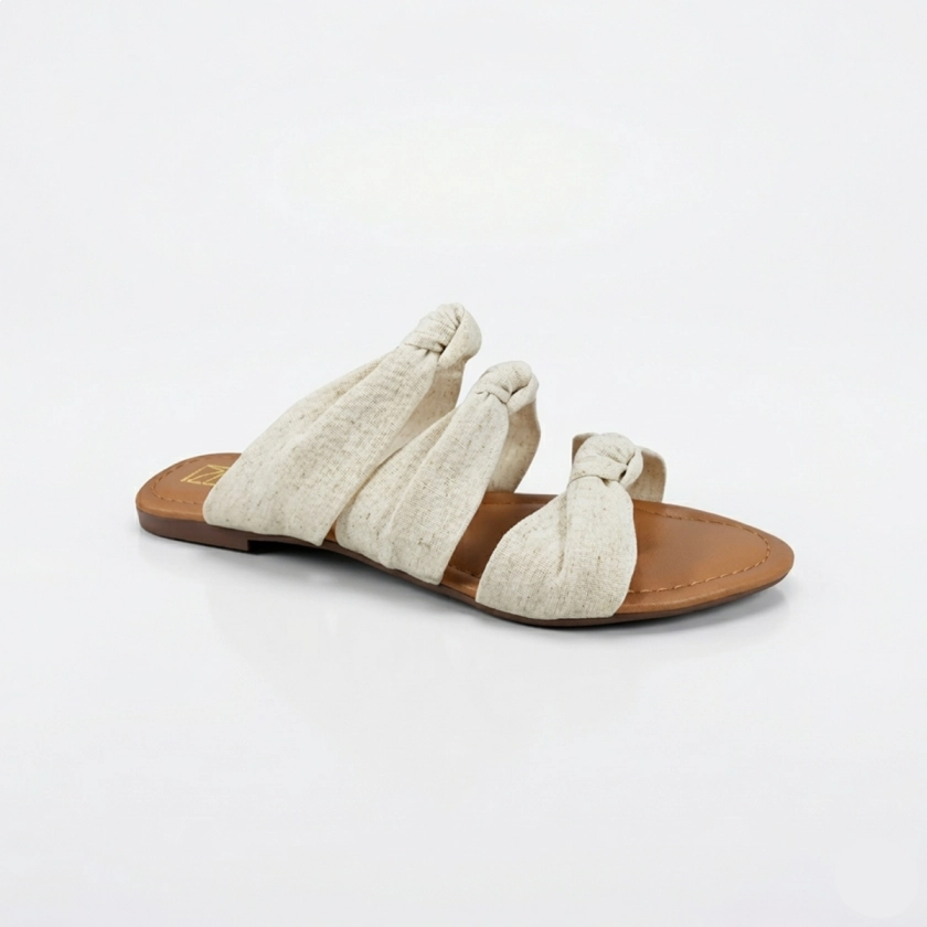 Sandália Rasteira Feminina Dok Stylus Detalhe Nó Nude Areia possui três tiras em
