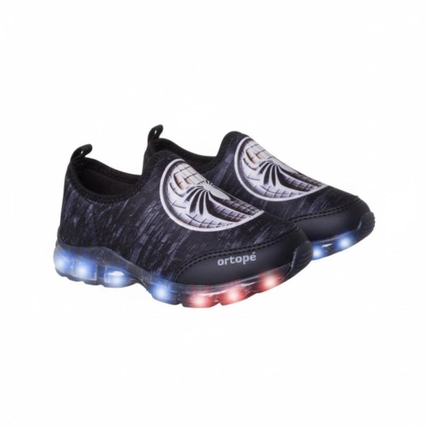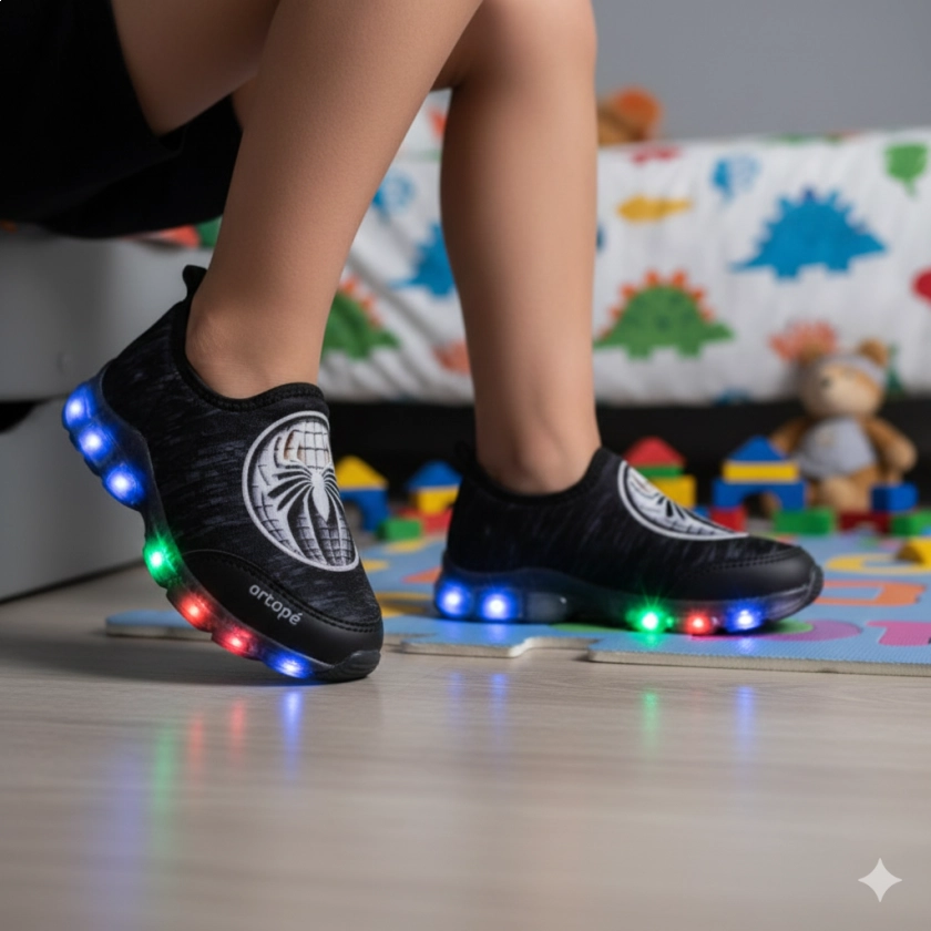 O Tênis de Led Infantil Masculino Ortopé Power Light Aranha Pretoé confeccionado em Tecido Helancamateriais super confotáveis trazendo bastante flexibilidade deixando os pézinhos aconchegados dentro do calçado. Solado em material TR Emborrachado que é antiderrapante trazendo mais segurança e firmeza nos passos das crianças. Projetado com Calce Fácil através da elasticidade do calçado proporcionando autonomia entre as crianças na hora de calçar.