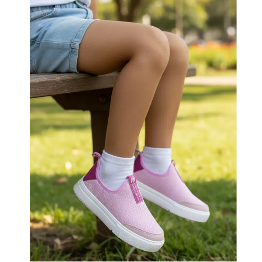 O tênis conta com cadarço elástico, proporcionando ajuste rápido e seguro, incentivando a independência da criança ao se calçar sozinha.