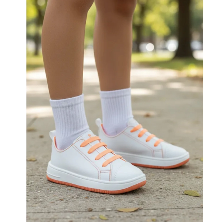 Produzido em material resistente na cor Branco com detalhes em Laranja, o modelo traz um visual moderno e versátil, combinando facilmente com diferentes looks casuais e escolares.