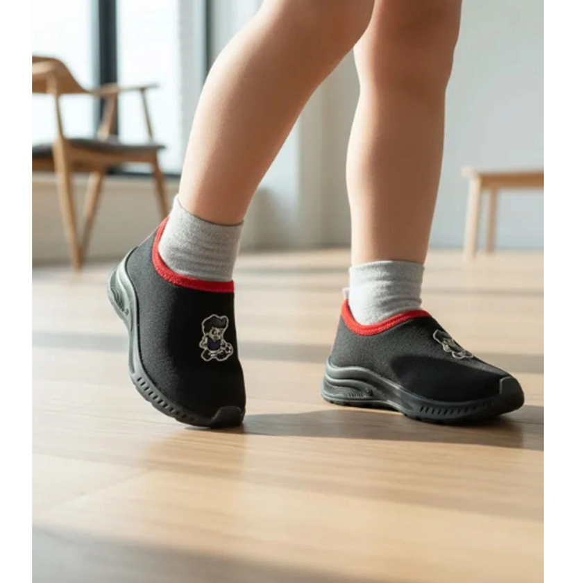 Este modelo dispensa cadarços e velcro, tornando o calce rápido e fácil. Assim, a criança ganha mais autonomia para se vestir sozinha, enquanto o design lúdico nas cores preto e vermelho adiciona estilo e diversão para passeios, escola e brincadeiras.